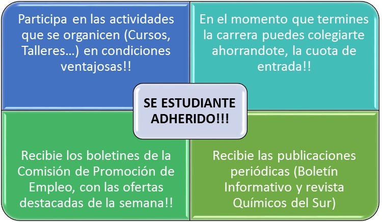 Para facilitar el conocimiento de la actividad profesional y contribuir a su formación científica, técnica y humana, podrá admitirse con carácter de Estudiantes adheridos, a estudiantes matriculados en estudios universitarios fundamentados en la Ciencia o la Tecnología Química y que así lo soliciten. Los estudiantes adheridos satisfarán la cuota reducida que se establezca específicamente para ellos (Estatutos de la Asociación de Químicos de Andalucía, AQA, Artículos 35 y 43).