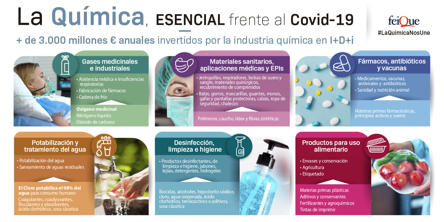 La actual crisis sanitaria supone un reto sin precedentes al que la Industria Química española está respondiendo desde su inicio redoblando su capacidad productiva y dando prioridad en sus plantas de producción a la fabricación de bienes y equipamientos sanitarios, productos farmacéuticos o desinfectantes, necesarios para combatir el COVID-19, así como otros productos de primera necesidad esenciales para la salud y la alimentación con el fin de contribuir a garantizar la continuidad de la cadena de suministro.