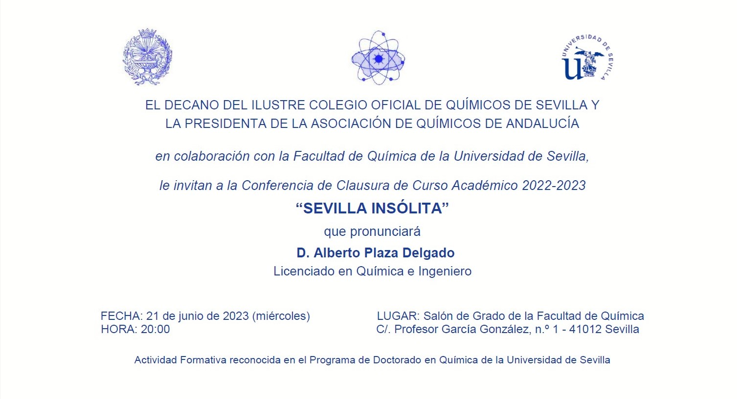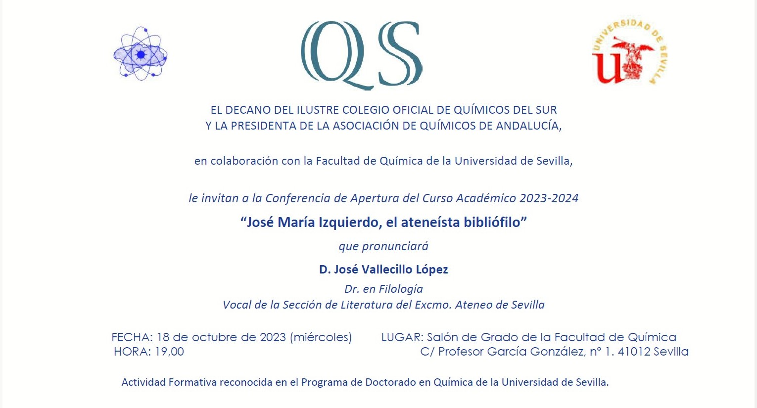 Conferencia Apertura Curso Académico 2023/2024. Fecha: 18 de octubre de 2023. Lugar: Salón de Grado de la Facultad de Química de Sevilla. Hora: 19:00h. Más información: CONFERENCIA D. JOSÉ VALLECILLO.
