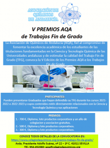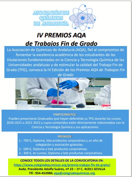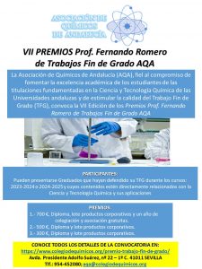 La Asociación de Químicos de Andalucía (AQA), fiel al compromiso de fomentar la excelencia académica de los estudiantes de las titulaciones fundamentadas en la Ciencia y Tecnología Química de las Universidades andaluzas y de estimular la calidad del Trabajo Fin de Grado (TFG), convoca la VII Edición de los Premios Prof. Fernando Romero Trabajos Fin de Grado AQA.